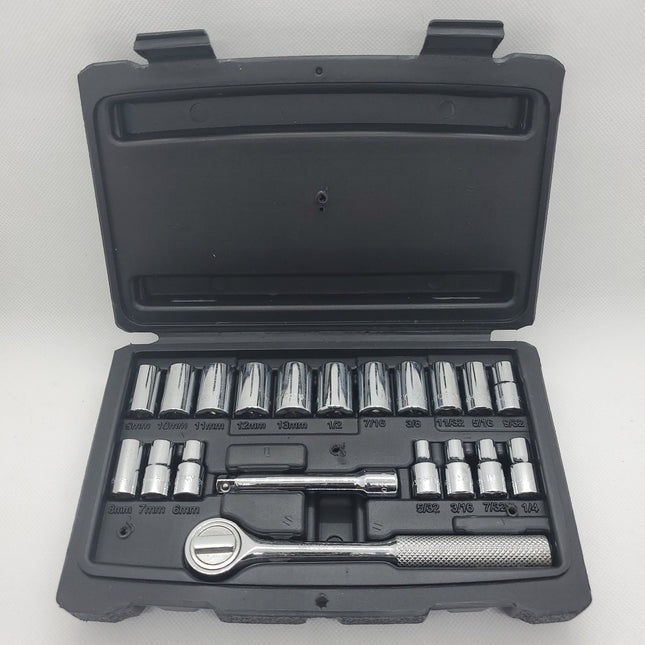 When it comes to durability and versatility, the Husky 20-piece 1/4 in. Drive Socket Set is a reliable choice. This socket set is designed to handle a wide range of basic fastening or repair projects with ease. Forged from Chrome Alloy steel, the sockets in this set are built to withstand heavy-duty use and provide exceptional durability and strength. Whether you're tightening bolts, nuts, or other fasteners, you can rely on the quality construction of these sockets to get the job done. The set includes 18 different sockets, offering both SAE (10 sockets) and Metric (8 sockets) measurements. This comprehensive range ensures that you have the right size socket for various applications, allowing you to tackle different projects with confidence and efficiency. In addition to the sockets, the set includes a 1/4 in. drive ratchet and a 3 in. extension bar. The ratchet provides smooth operation and allows for easy switching between sockets, while the extension bar provides added reach and access to tight or hard-to-reach areas. Whether you're a professional mechanic or a DIY enthusiast, the Husky 20-piece 1/4 in. Drive Socket Set is a valuable addition to your tool collection. Its durability, versatility, and wide range of socket sizes make it suitable for a variety of fastening or repair tasks. Invest in the Husky 20-piece 1/4 in. Drive Socket Set and experience the convenience and reliability it offers. With its quality construction and comprehensive socket selection, you'll have the tools you need to tackle your projects with confidence and precision.
